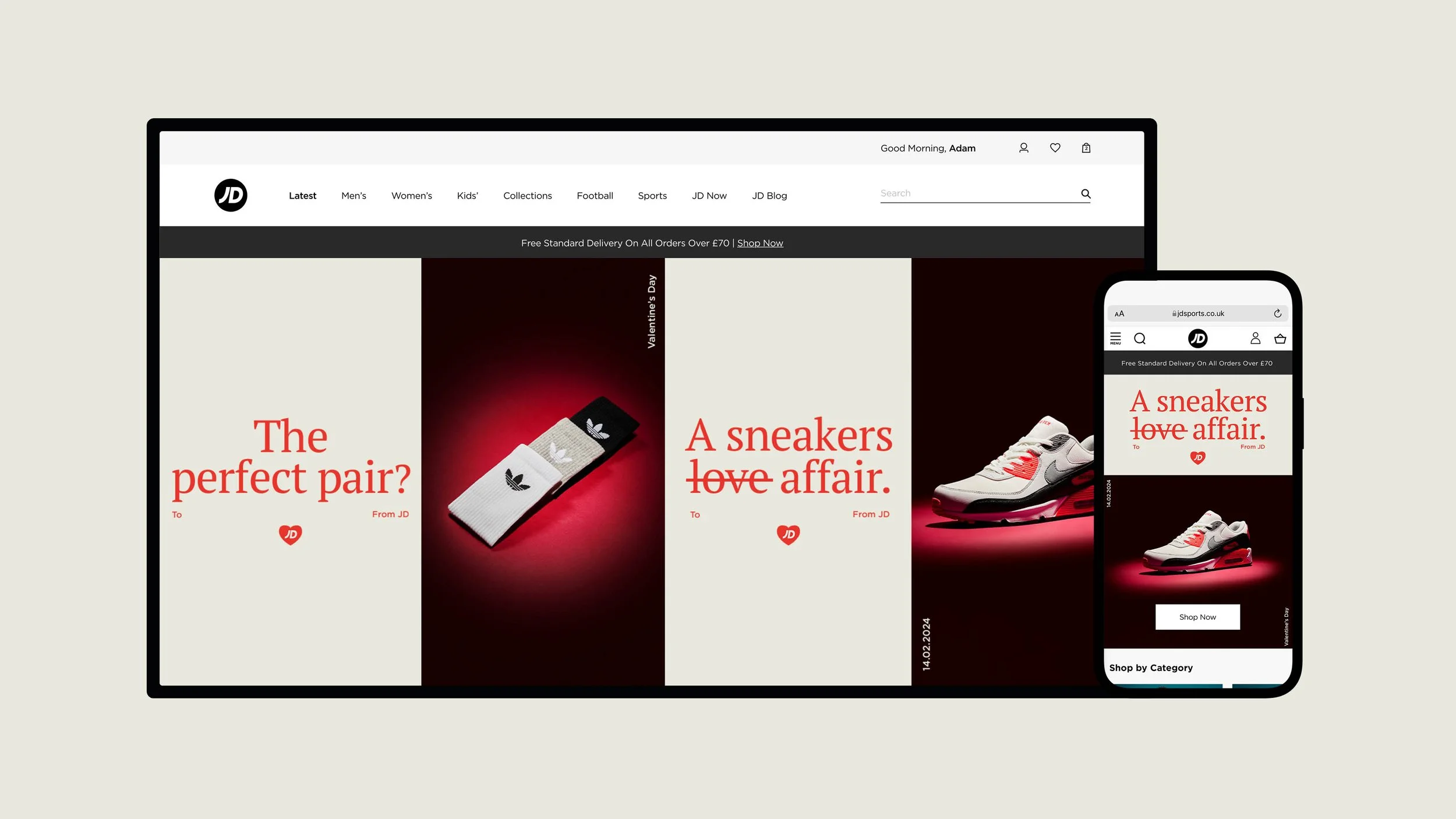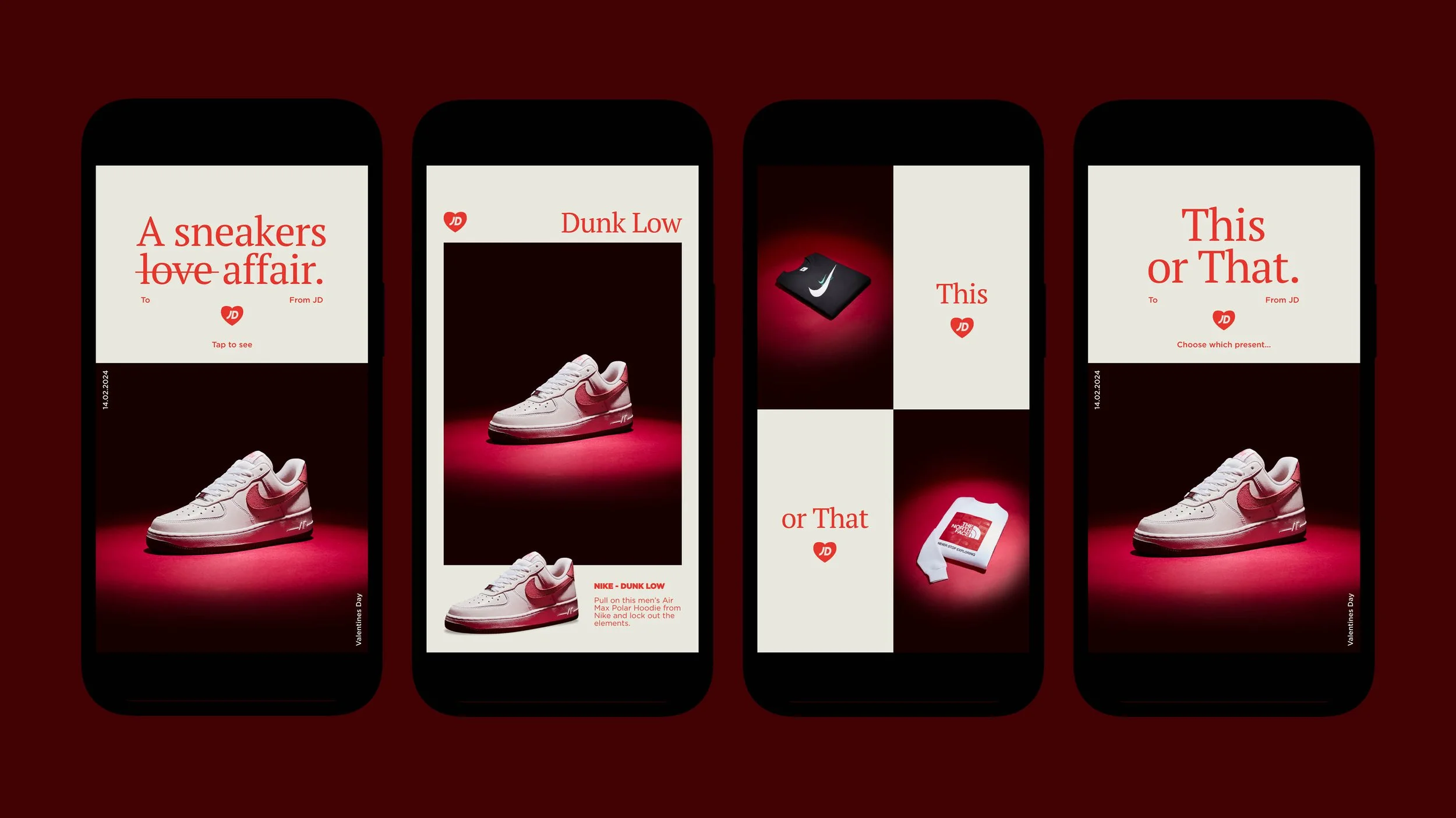 This year I worked alongside the creative team to concept a narrative that was in keeping with Valentine’s Day traditions, whilst carving out an identity inline with JD Sports. I briefed the photography team to create a suite of assets that would complement my design using ‘The Perfect Pair?’ as our tagline.