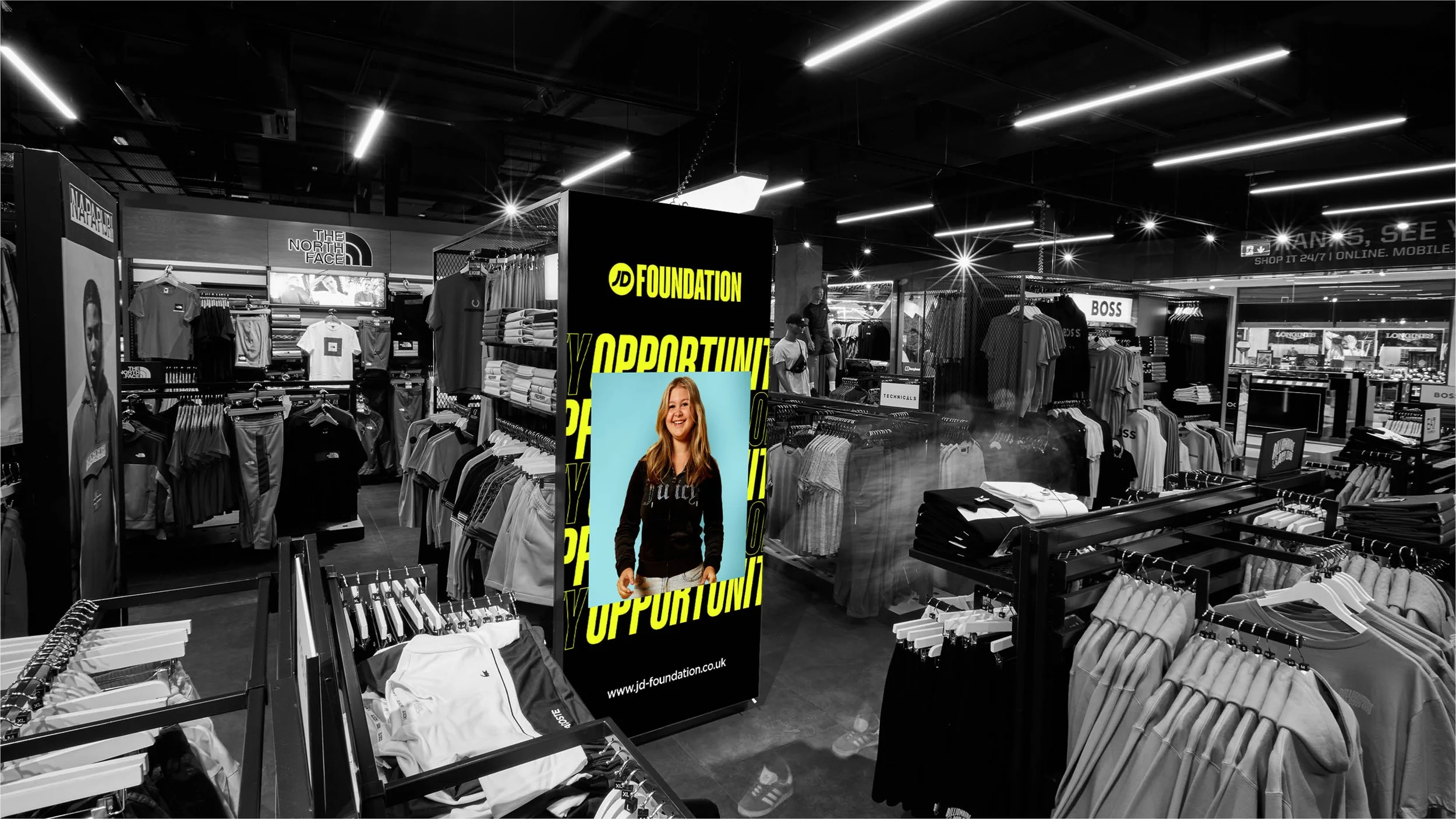JD foundation found itself lacking identity. I was briefed to refresh the brand to give it a youthful persona. The rebrand was centred around impactful typography alongside the use of clean imagery. After rolling out the rebrand I have been responsible for ensuring brand guidelines have been met as well as educating the wider studio team on how to apply the brand.